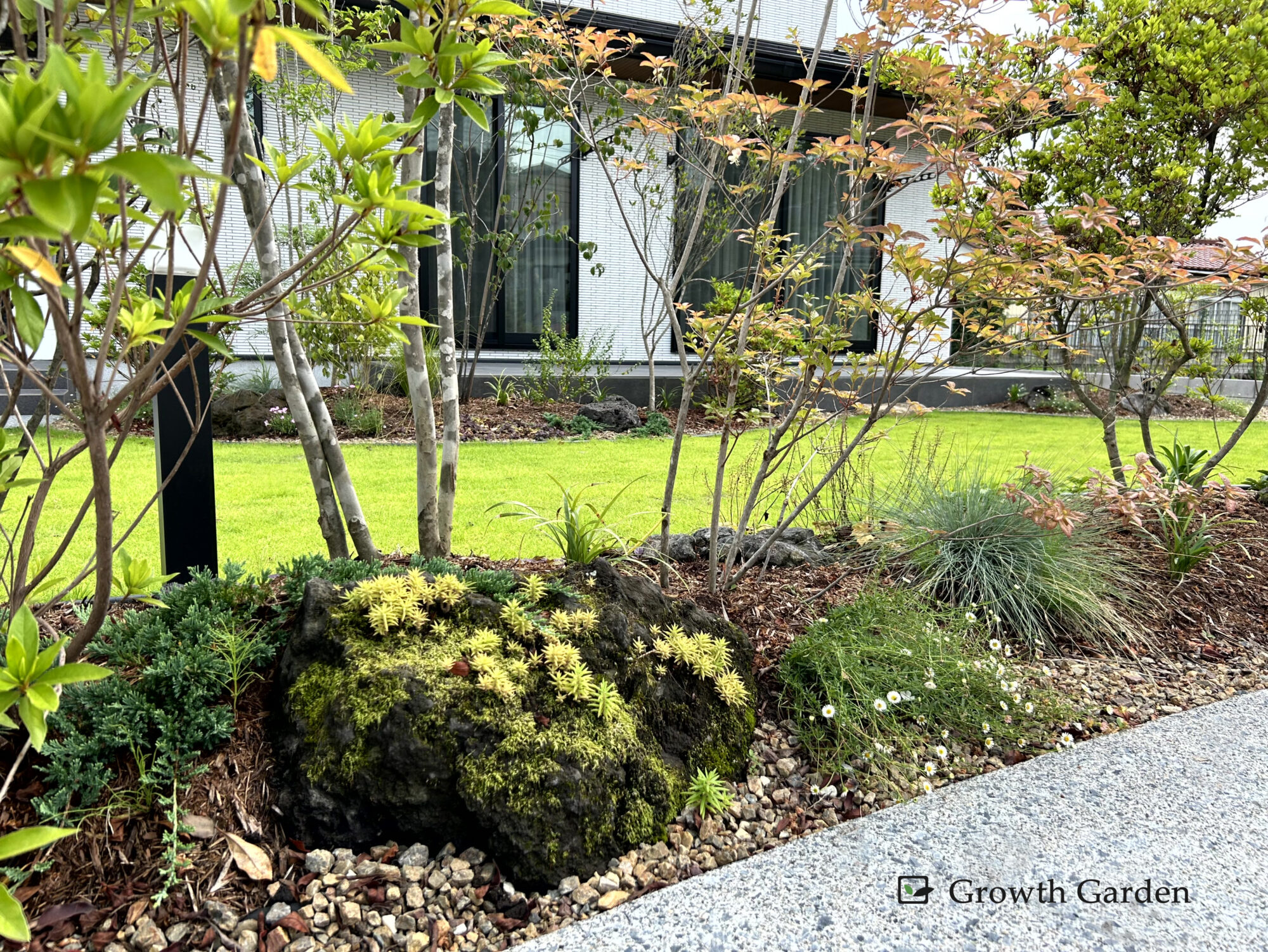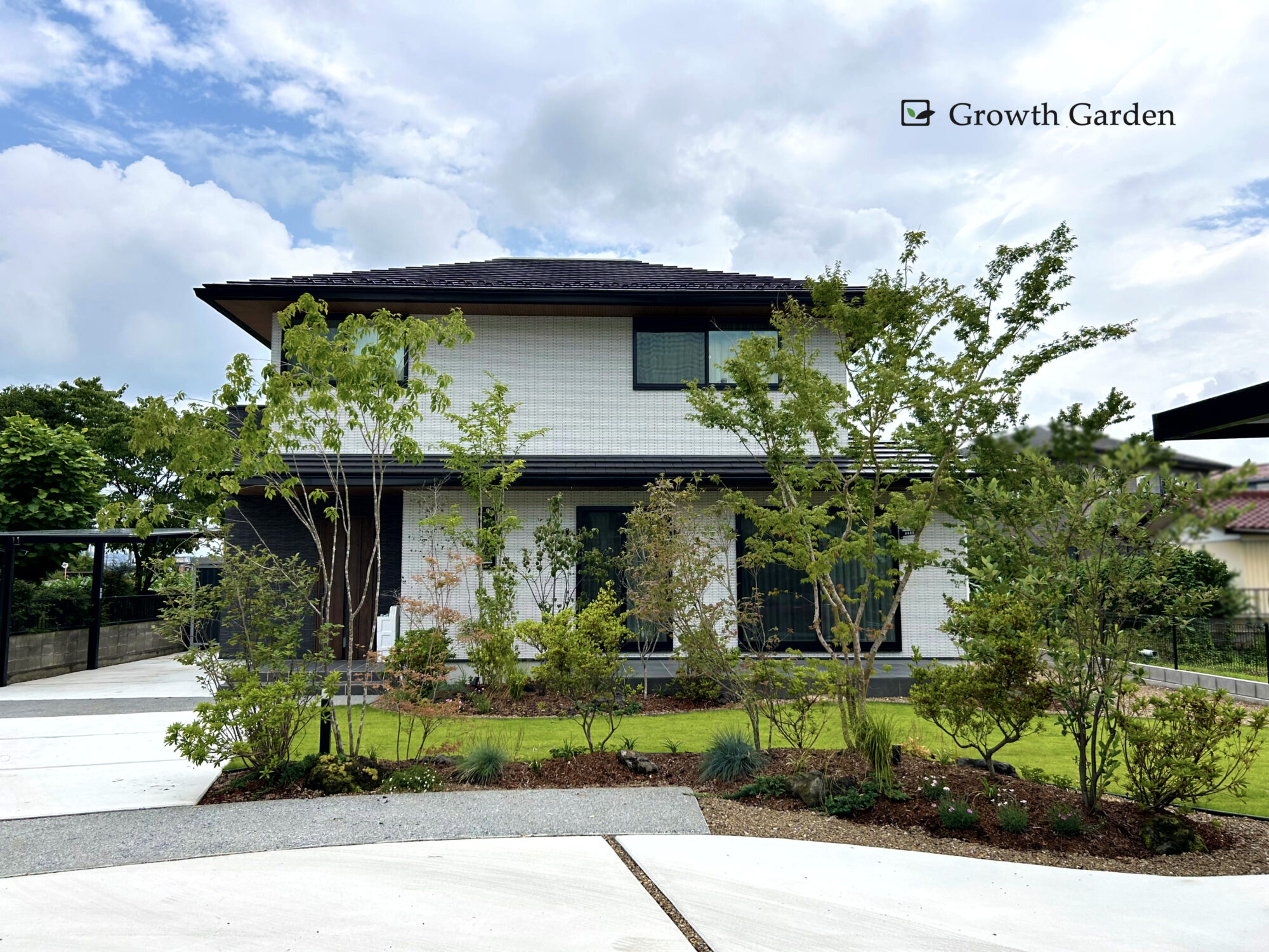 夏は直射日光を遮り日陰を確保します。リビングから見る植栽越しの景色も美しいですよ。