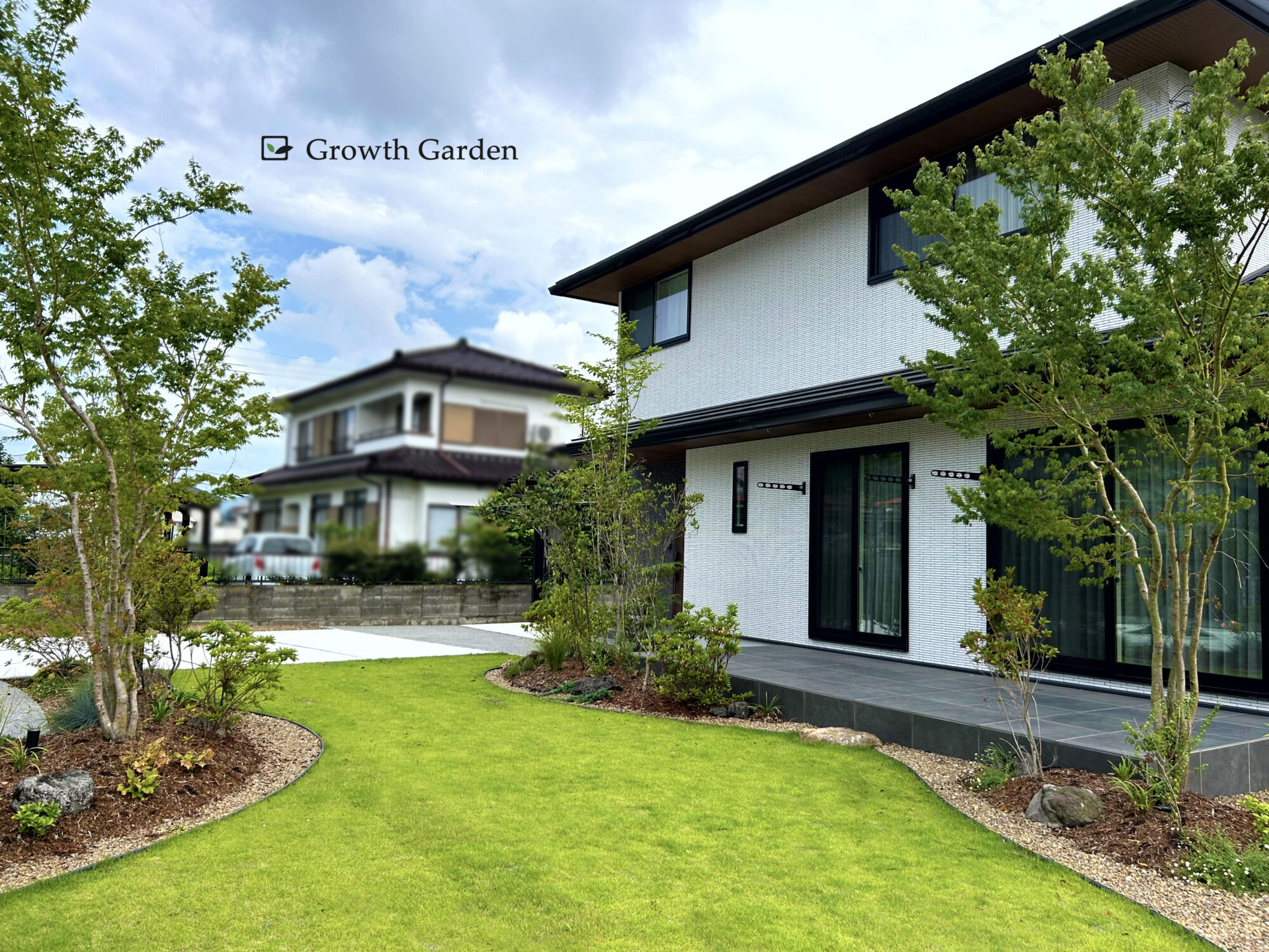 大きく広く設計されたテラスには、高中低さまざまな植栽が寄せてあります。